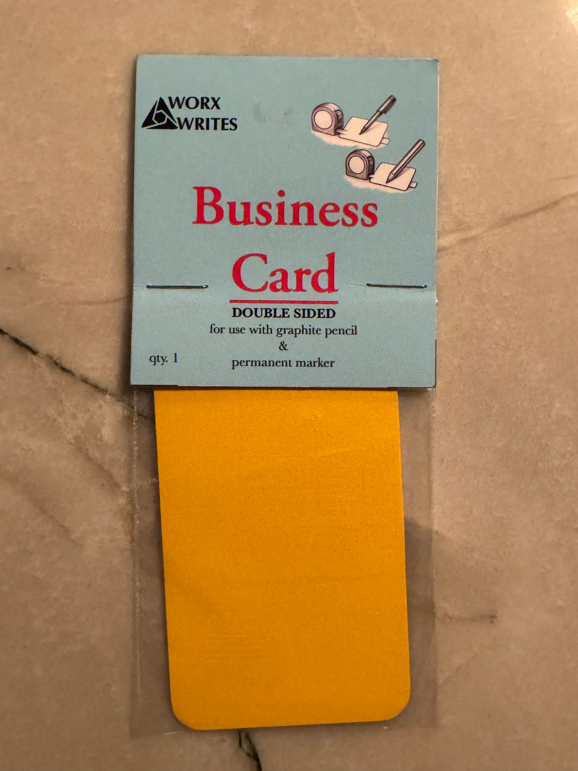 The Business Card. A traditional size that can easily be slid in and out of a pocket. This size allows for storage in a ID holder if worn. Double sided, yellow for graphite pencil and white for permanent marker. Sold individually.